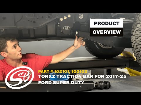 Click to watch the S&B Torxz Traction Bar Overview. Our Torxz Traction Bars fit all 2017+ Super Duty trucks and are provide a huge improvement in drivability and towing performance. Urethane bushings at both ends and an innovative mounting system allow for full suspension travel and articulation and prevent shock loading for optimal traction. It is the most beneficial traction bar on the market.